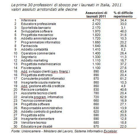 Esistono poi le cosiddette professioni introvabili; tra queste gli Ingegneri delle telecomunicazioni da impiegare come di consulente di prodotti informatici oppure ingegneri civili da assumere come addetti alla logistica.
